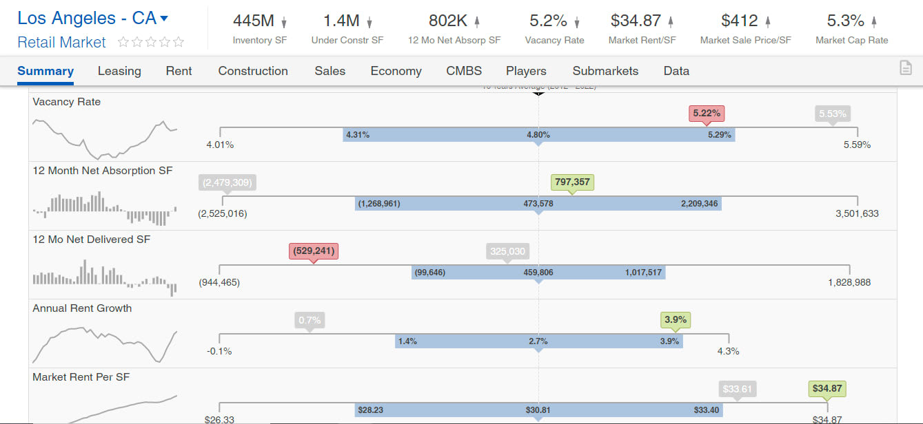 So, the good news is occupancies in Los Angeles' retail sector have improved in recent quarters, after seeing vacancies rise for years, before and during much of the pandemic. Grocery stores and fitness centers have been important drivers of the market, taking large spaces in area shopping centers as well as mixed-use developments. Rents saw modest losses in 2020, but gains have accelerated since the beginning of last year and are up 3.4% from a year ago.